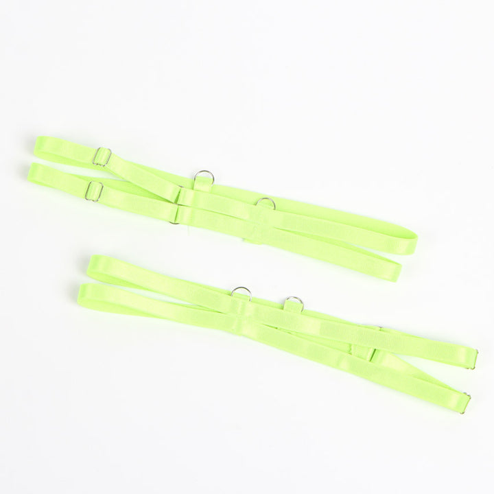 This eye-catching, neon set includes a lace bra top with contrast neon trim, adjustable straps, a panty, and matching garterbelt with adjustable garter straps and attached leg garters.