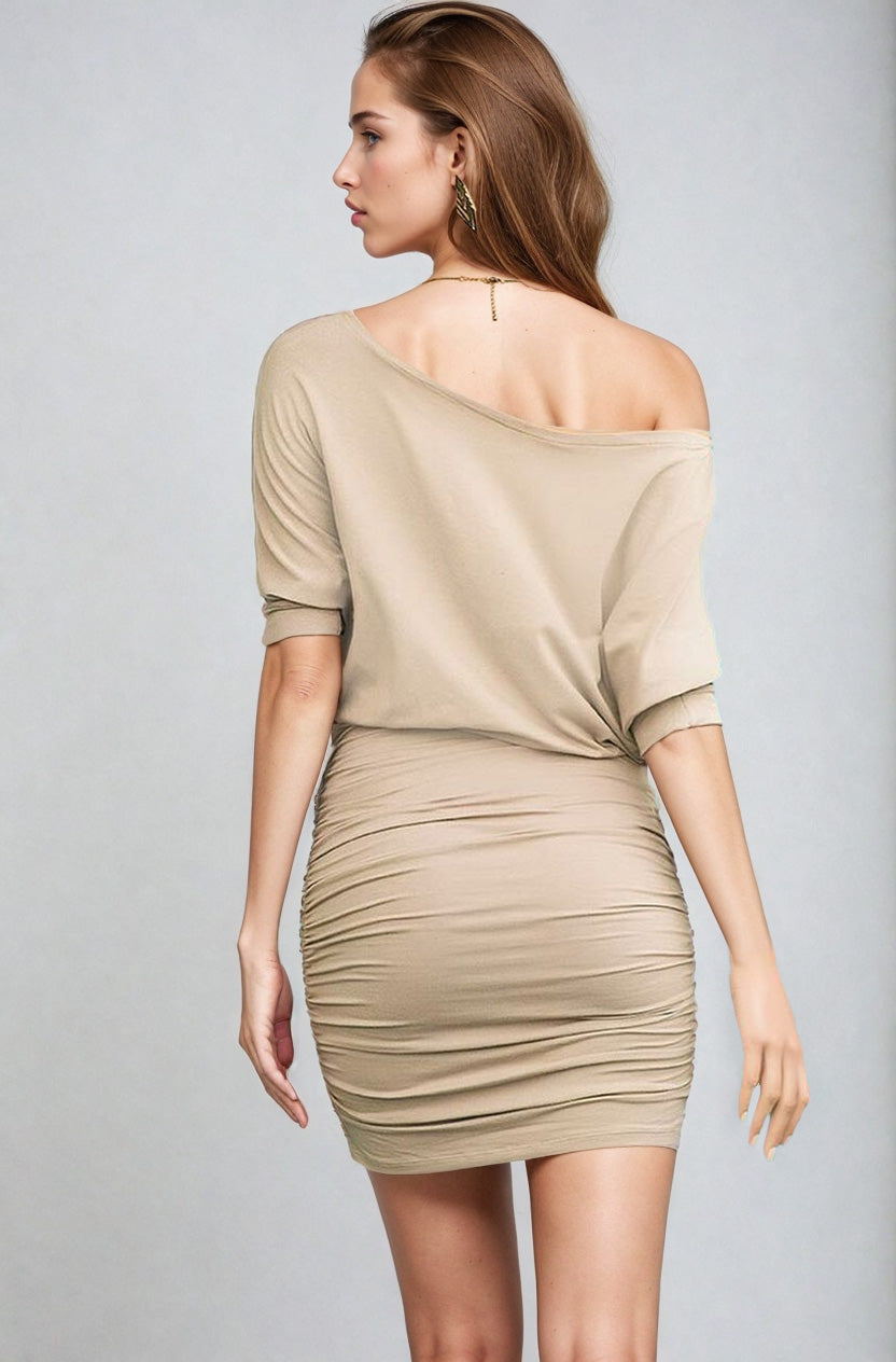 Simply sexy! This classic little mini dress is the perfect wardrobe staple featuring an off-the-shoulder silhouette with short sleeves, billowing bodice and multi-shirred, side-seamed fitted skirt with flattering straight hemline.