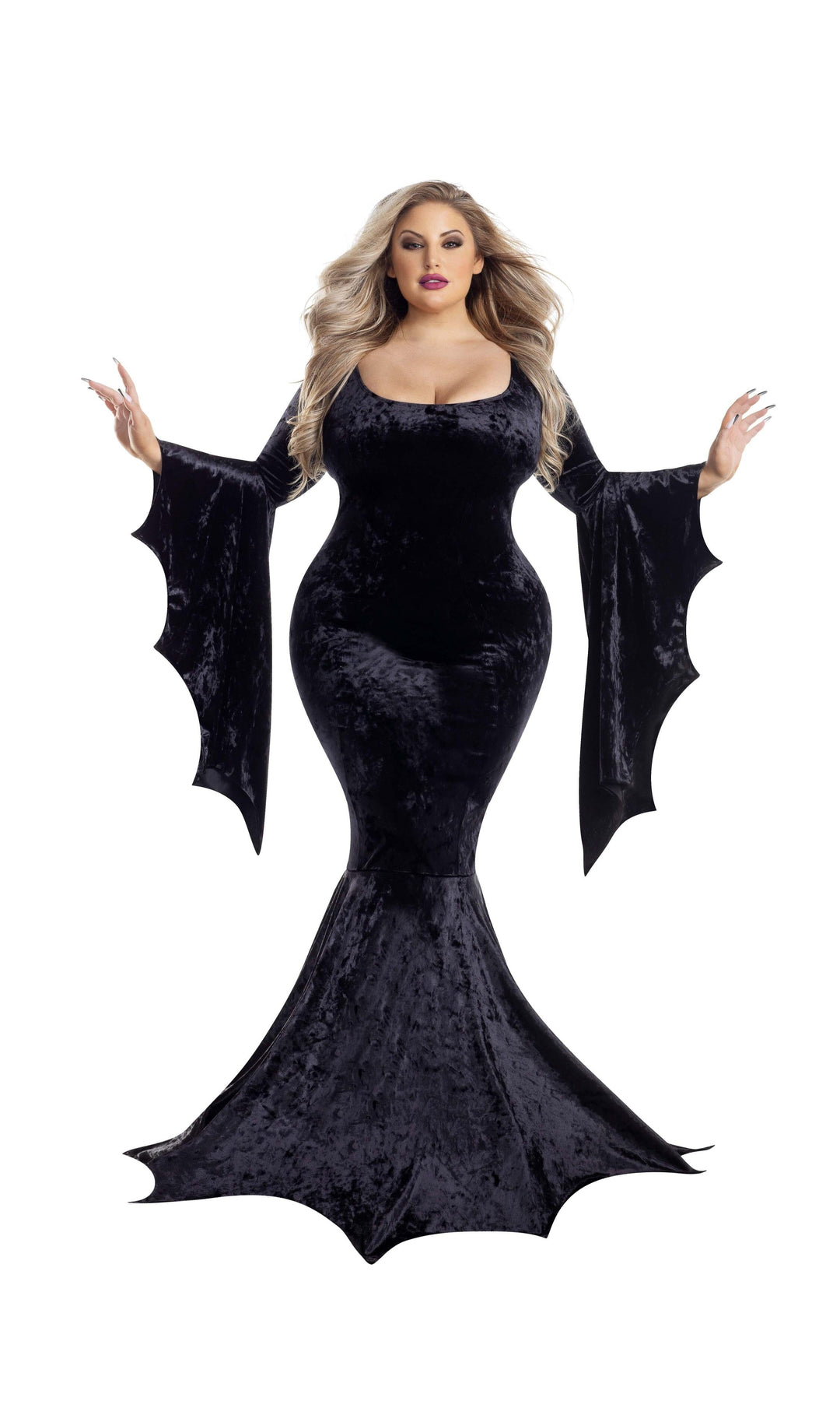 This Sexy Vamp costume dress is a soft black crushed velvet with gothic hem, scoop neck, and long sleeves.
