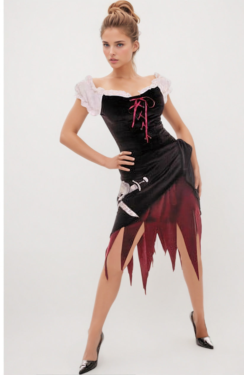 Ahoy matey! Welcome aboard with our Pirate Wench costume. Show off your sea-faring skills and command the high seas with this fierce and flirty ensemble. With its detailed design and flattering fit, you'll be the most sought-after treasure on any ship. (Pirate's life for me!)