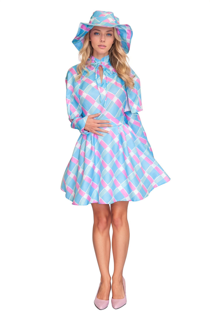 Travel to new lands in this plus size, Adventure Doll costume featuring a blue patterned drss with a cinched waist, an overcoat with neck clasp closure, belt, and hat.