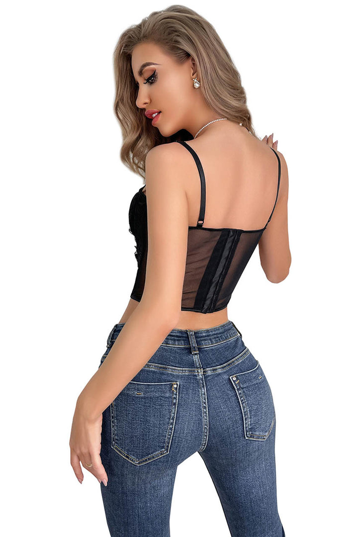 This plus size, black mesh and lace bustier features underwire cups, built-in boning, adjustable straps, and hook back.