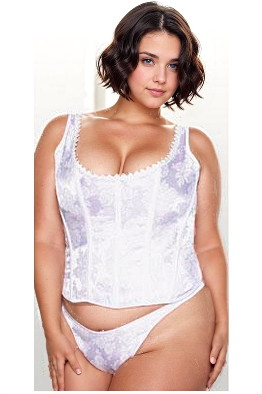 This plus size, black brocade corset features a tank-style silhouette, boning, and a lace-up back. (Thong not included.)