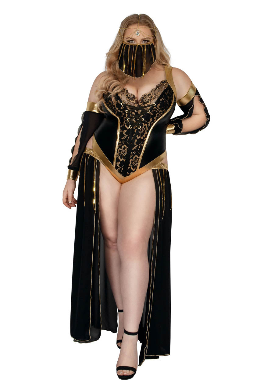 This plus size, Dark Harem Nights costume includes a black wet look spandex teddy with black and gold lace details throughout, an attached chiffon train with gold leg straps, grommet details, clasp back, separate tulip sleeves, a chiffon mask, choker, and rhinestone chain crown.