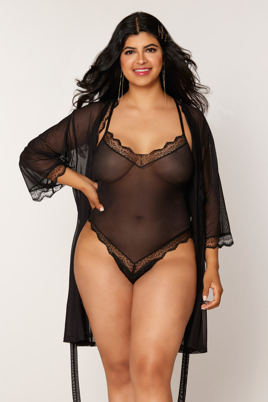 This plus size set includes a black mesh teddy with high cut hips, a deep V neck, lace trim, thong back, and a matching mesh robe.