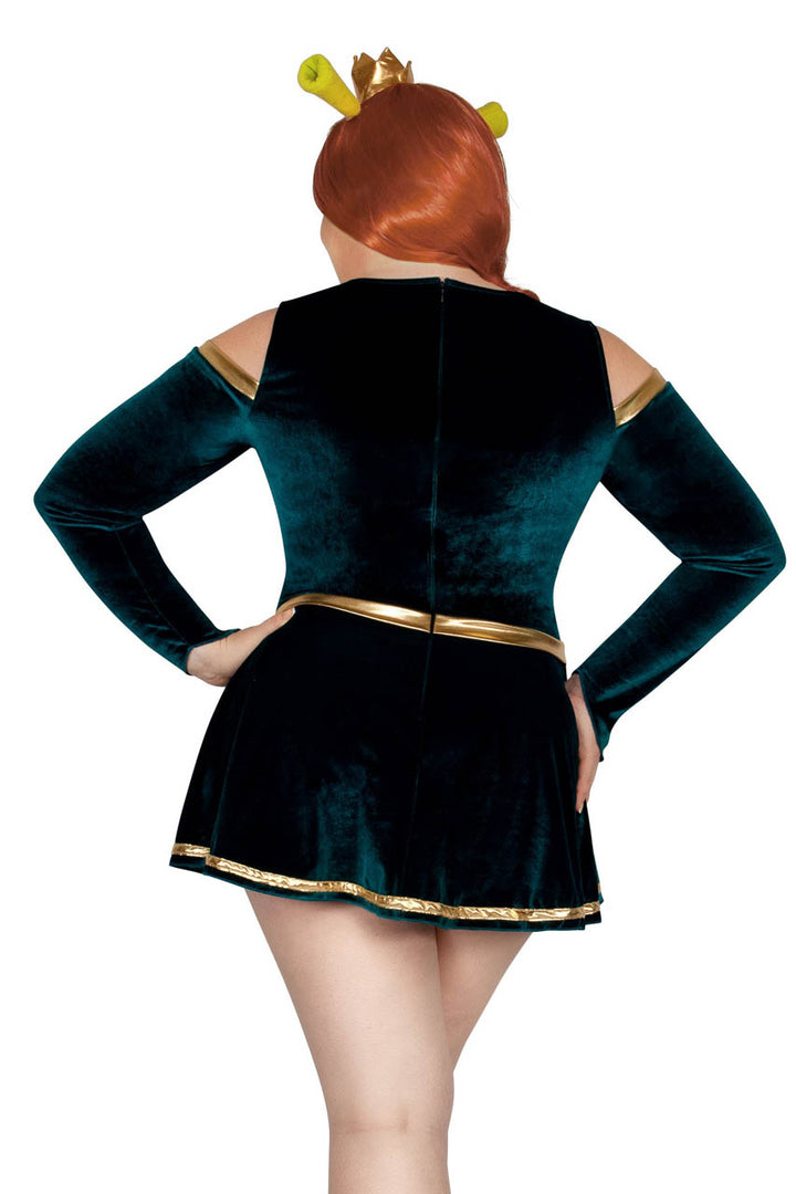 This plus size, Princess Ogre costume includes an olive velvet dress with black and gold jacquard front panel, built-in boning, cold shoulder detail, gold accents, matching shorts, a crown, and separate ogre ears.
