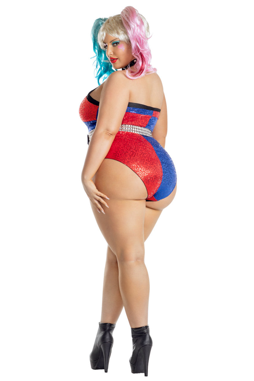 This plus size Sexy Suicide Gal costume includes a red and blue sparkle romper with a low cut neckline, choker, and belt. (Wig, stockings, and shoes not included.)