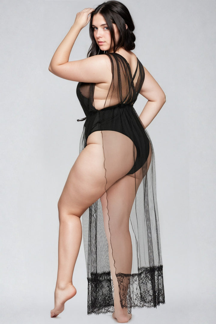 This plus size, black teddy features a low cut bust with a cheeky back and a long mesh overskirt with a satin tie closure.