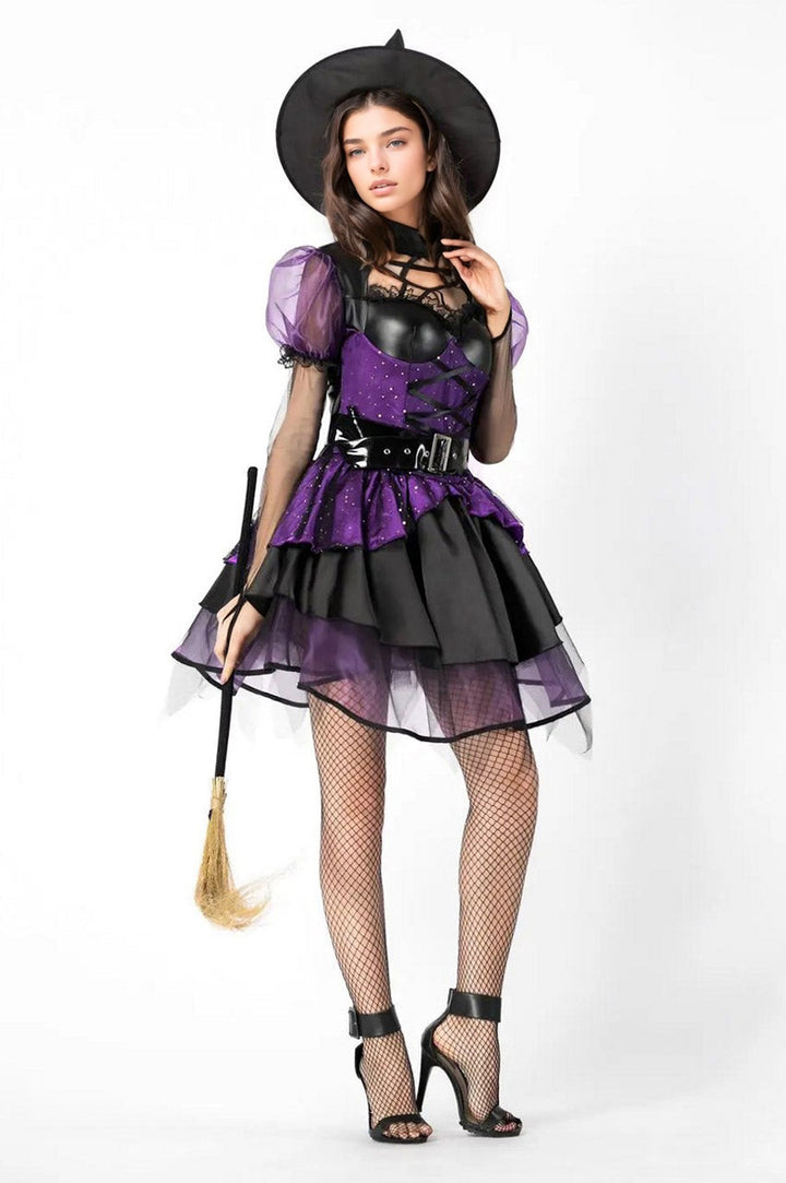 This Pentagram Witch costume includes a black and purple, layered mesh dress with a strappy pentagram bust, a belted middle, and matching hat. (Gloves, stockings, and broom not included.)