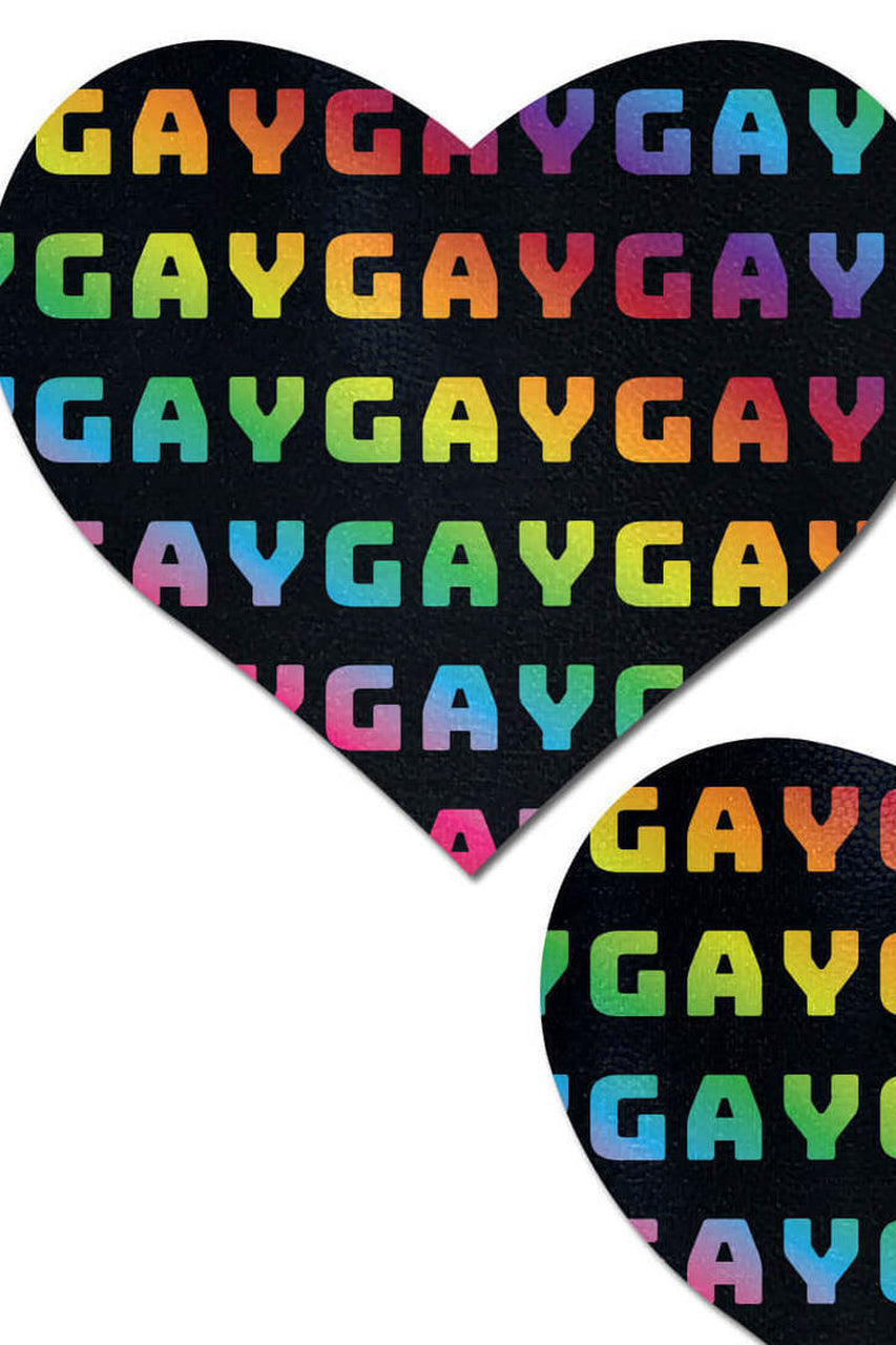 Rainbow gay on black heart nipple pasties that feature hand-made in the USA matte pleather material that forms to curves and resists wrinkling over hardening nipples. Just peel-and-stick on clean, dry skin. Features latex-free, medical-grade, waterproof adhesive that stay securely in place!