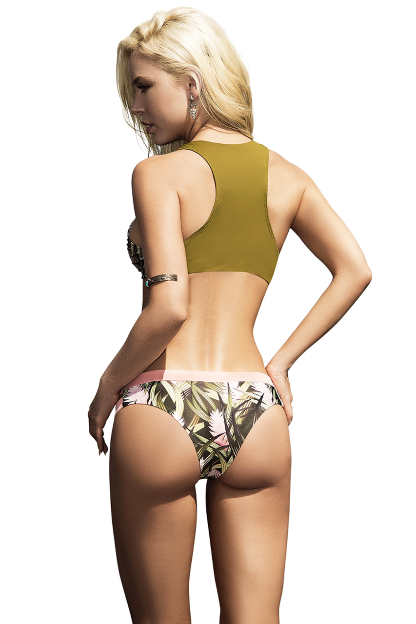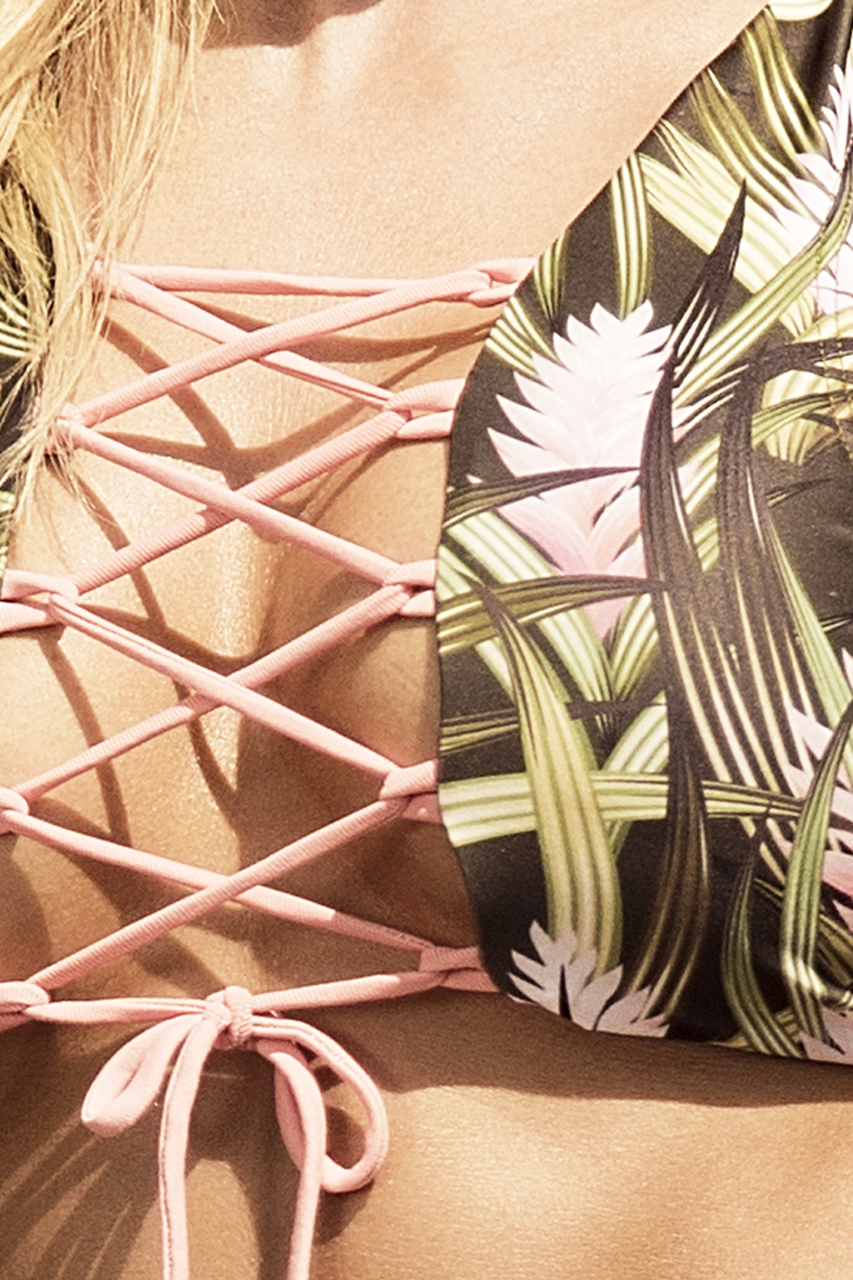 Make an edgy statement in this Rebel Heart Leaf Print Bikini Set featuring a palm tree print bikini with pink lace up front, olive green back, and unpadded cups. Includes palm leaf print bottoms with high cut back and pink strappy side detail. Fully lined. Features no padded cups and no cup inserts.