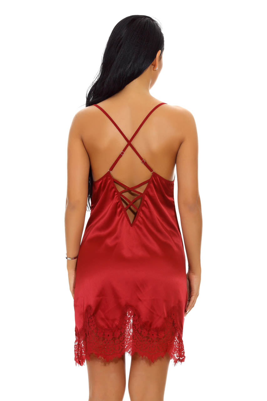 This flirty, satin chemise lingerie features a patterned lace hemline, lace trim cups, cross over back straps, criss cross detail, and a matching panty.