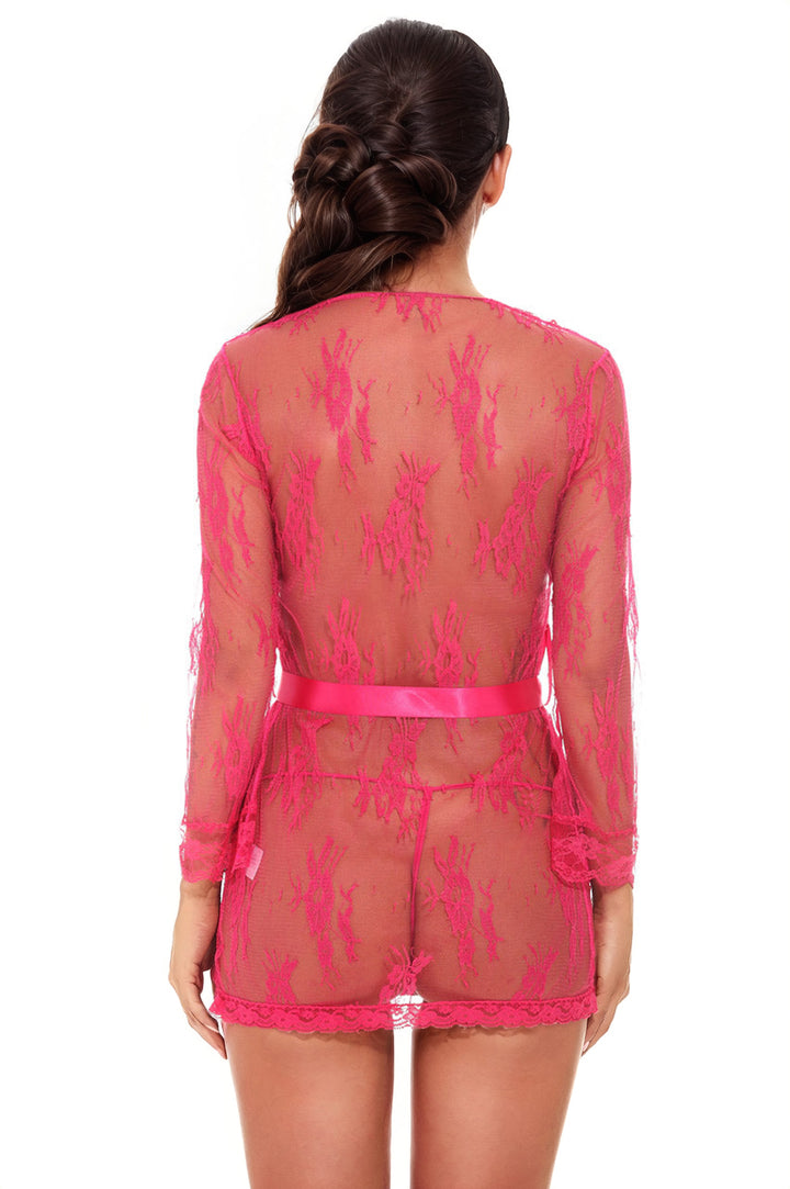 This romantic lace robe features a rose lace pattern, scalloped lace trim, long sleeves, satin belt, and thong.