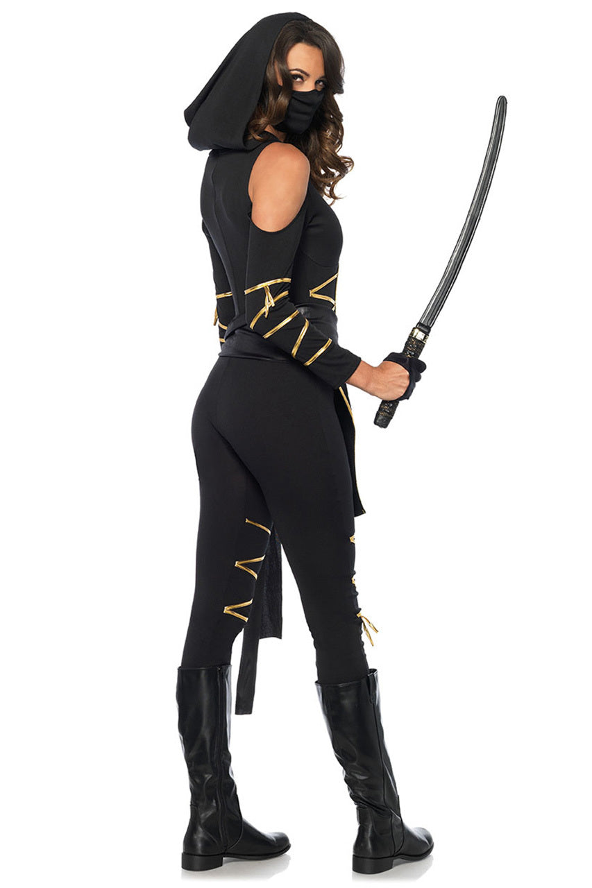 They'll never see you coming in this three-piece, Sexy Stealth Ninja costume featuring a black hooded catsuit with gold print details, cold shoulder cut outs, a waist sash and a face mask.