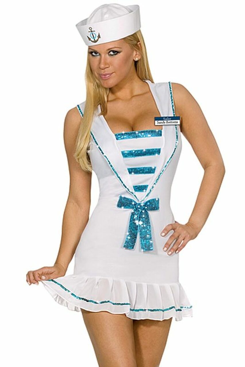 2 Piece Sexy Sailor Costume includes Stretch Knit Dress with Large Sequin Anchor Applique on Back Sailor Collar and Sequin Stripes Down Front Neckline. Pleated Section with Sequin Stripe at Hemline. Includes Sailor Hat with Sequin Anchor Applique Complete set with couples costume #D5234 Captain Dick C Normous not included.