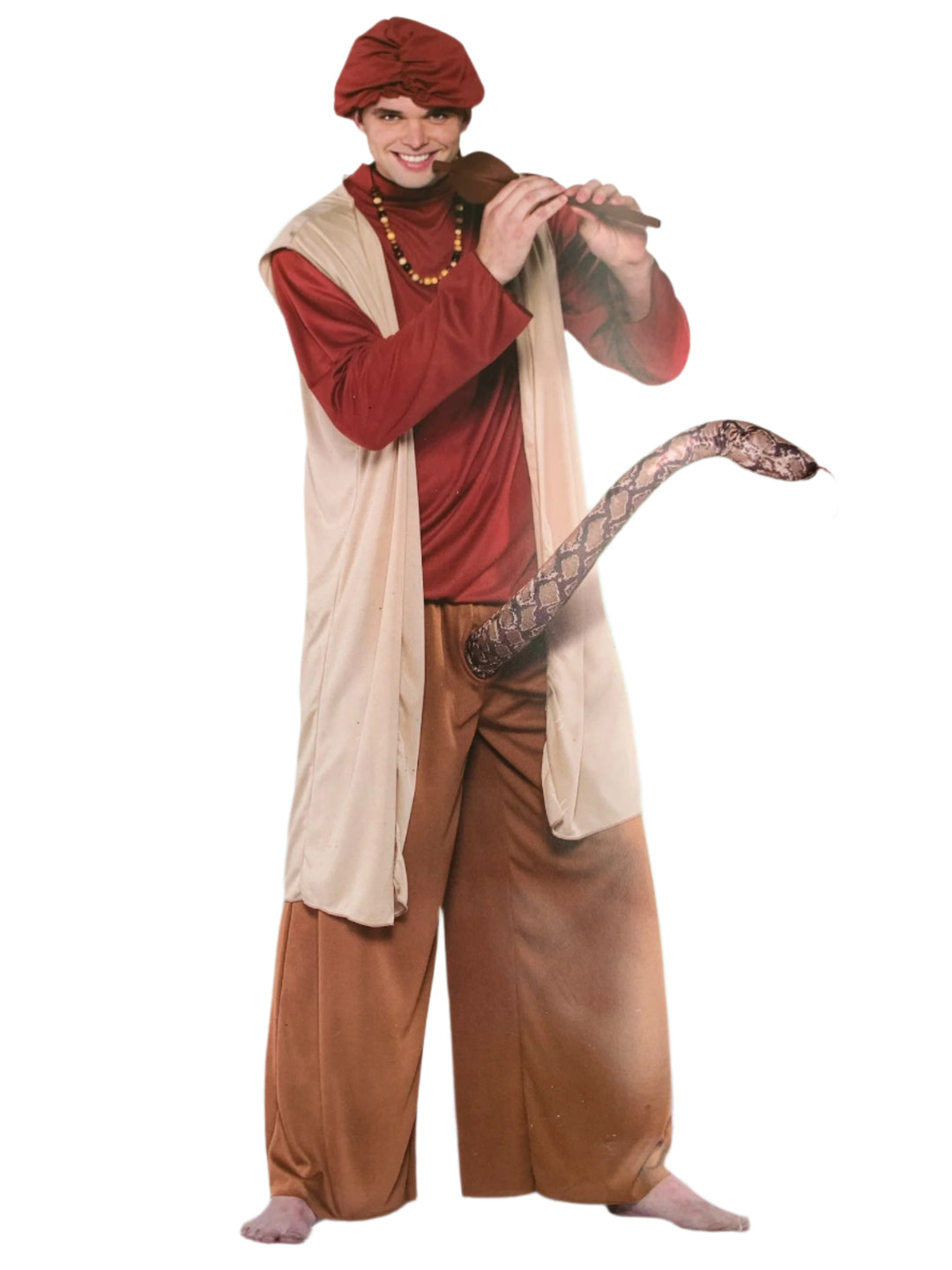 Step into a world of enchantment with the playful Snake Charmer set, featuring a playful tunic, vest, and pants that bring your costume to life. Complete the look with a mesmerizing snake prop, a charming necklace, a melodic flute, and an eye-catching headpiece.