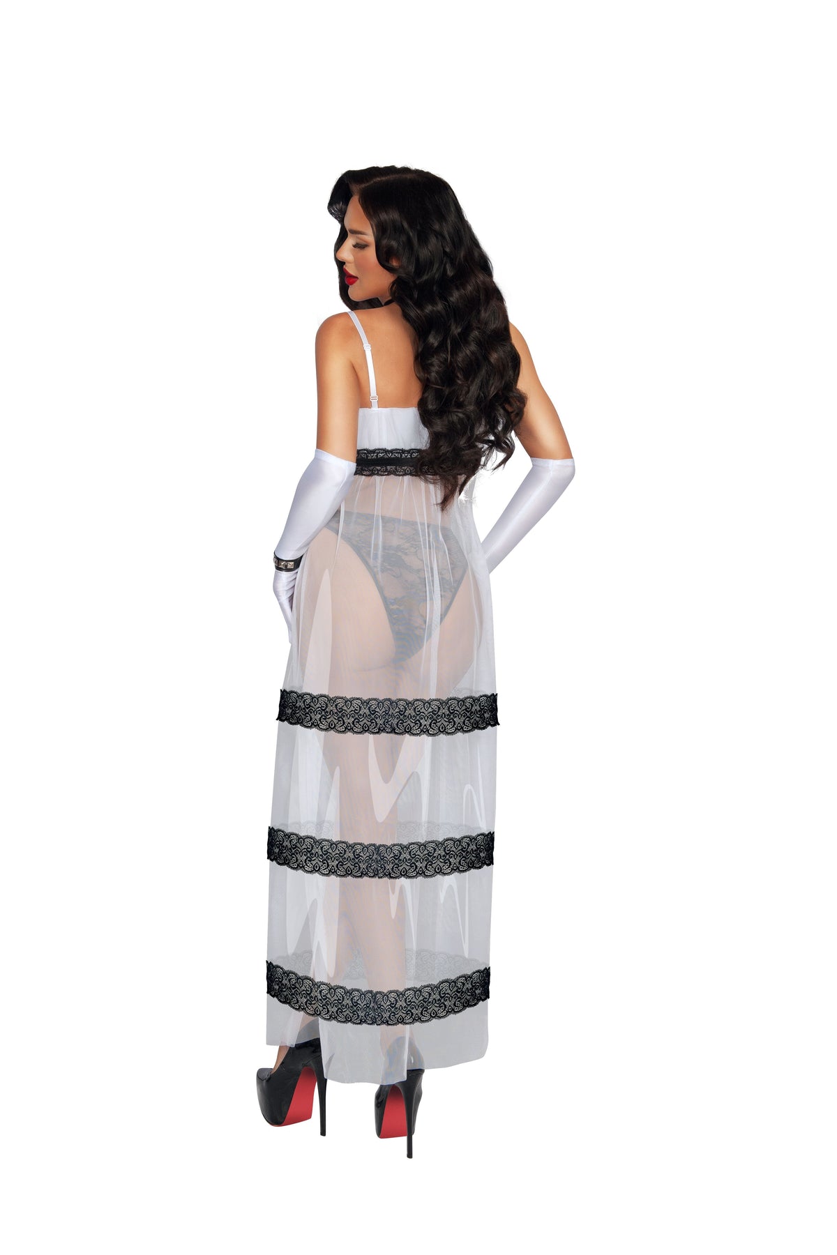 This Blood Thirsty Babe costume includes a sheer white gown with black lace, faux blood stains, a matching black lace panty, choker, gloves, and bracelet.