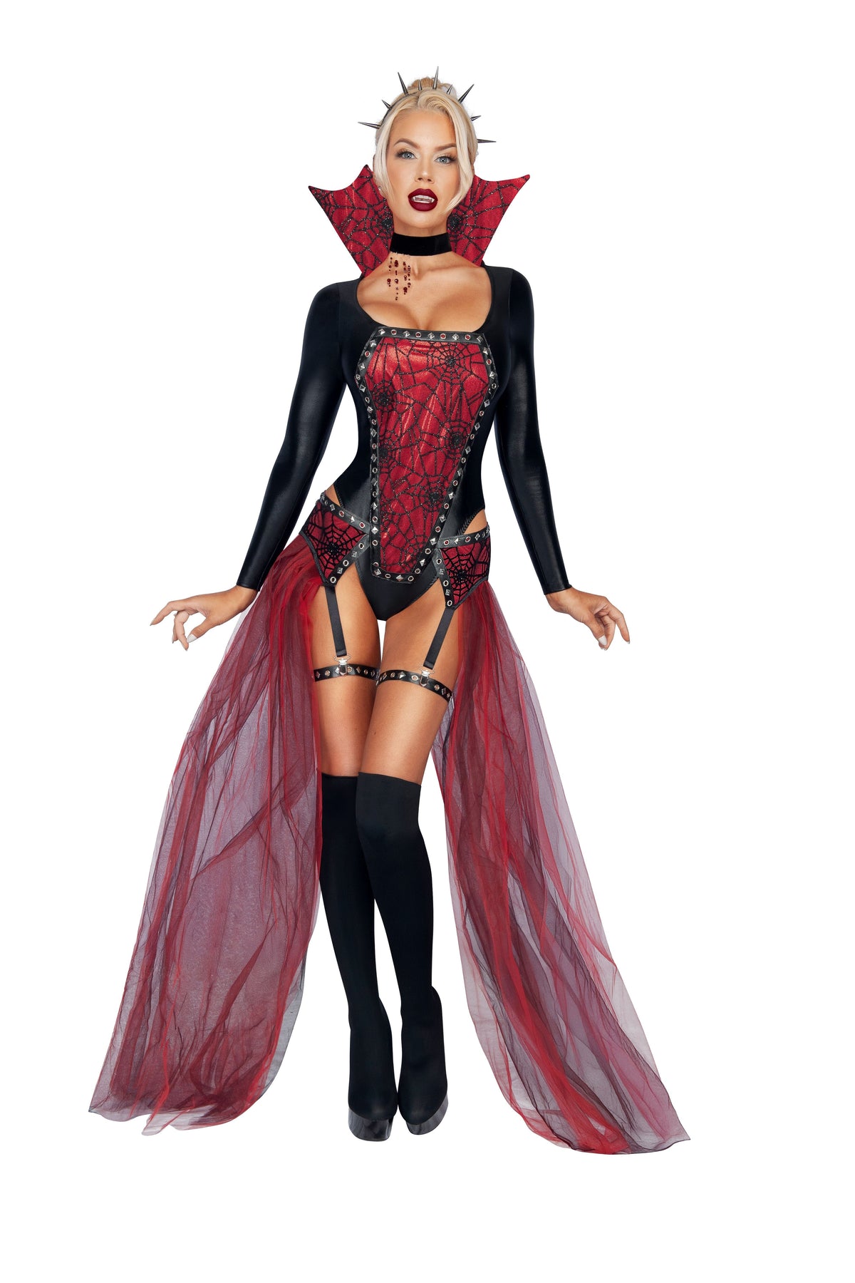 This Coffin Queen costume includes a black and red spandex romper with coffin detail, a garter belt with an attached red and black tulle skirt, a removable collar, separate garter straps, a headband, and a blood drop choker. Hosiery not included.