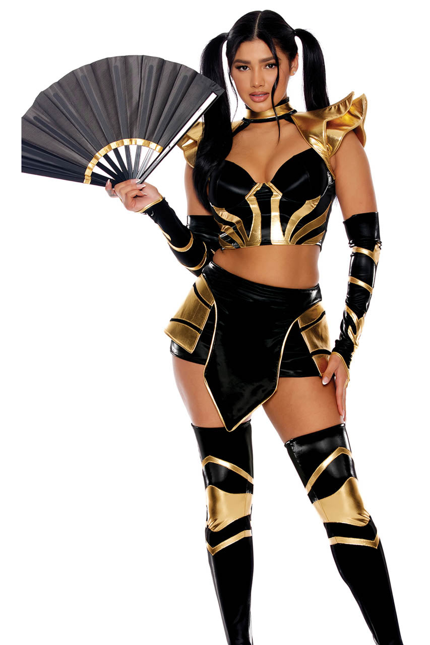 This five-piece, Sexy Striker costume features a mock neck top with underwire bra cups, velvety soft vinyl fabric with contrast color blocked panels, padded shoulders, a matching skirt, leg accessories, fingerless gloves, and fan.