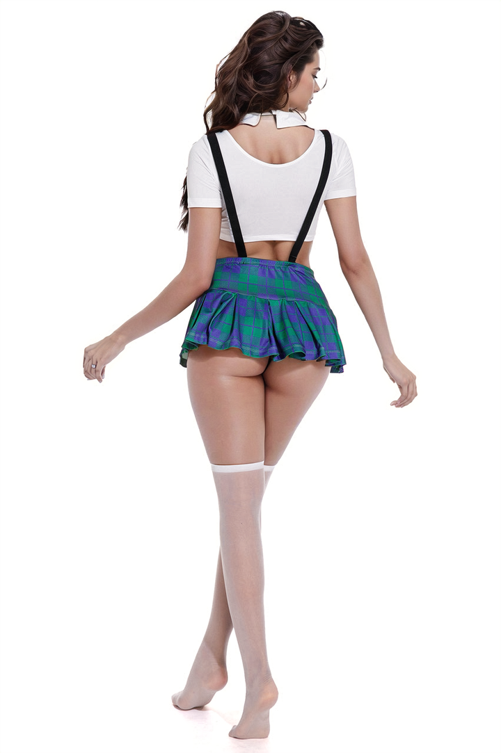This six-piece, Sultry School Babe costume includes a white crop top with underboob cut out, a blue and green plaid skirt, a cop on collar with attached tie, glasses, suspenders, and knee high stockings.