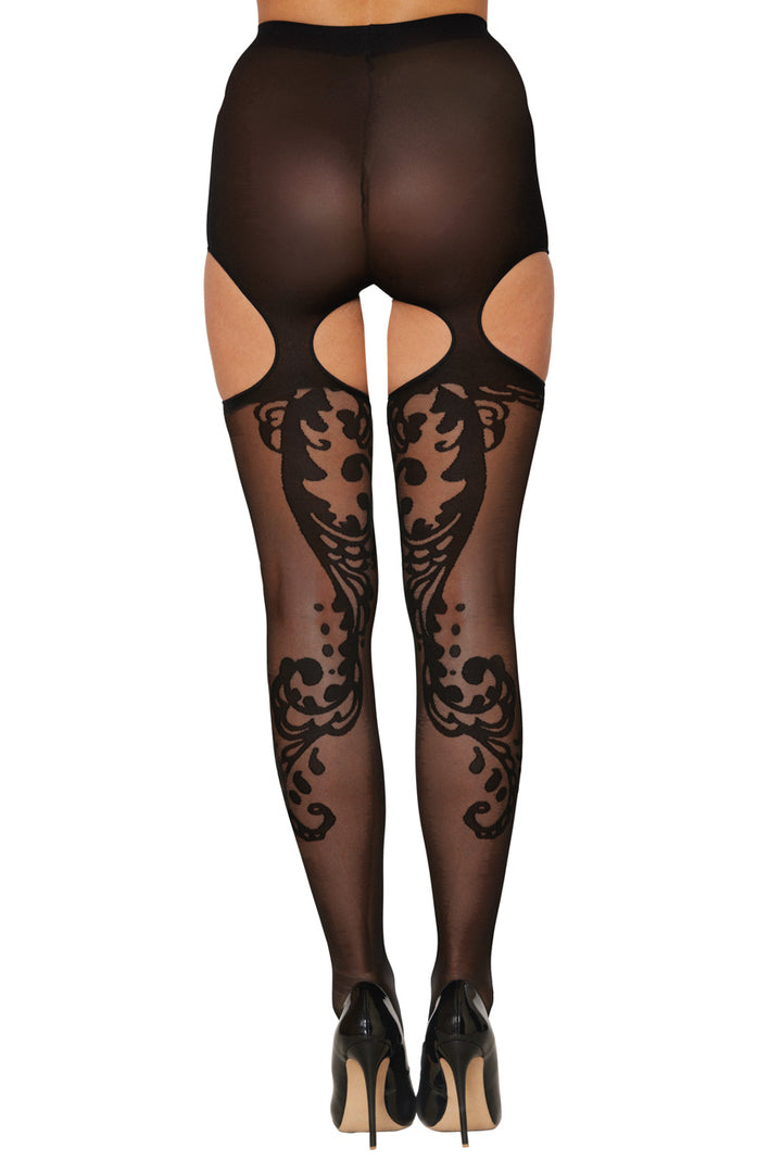 These sheer mesh garter pantyhose have a swirl jacquard pattern, and cut out sides.