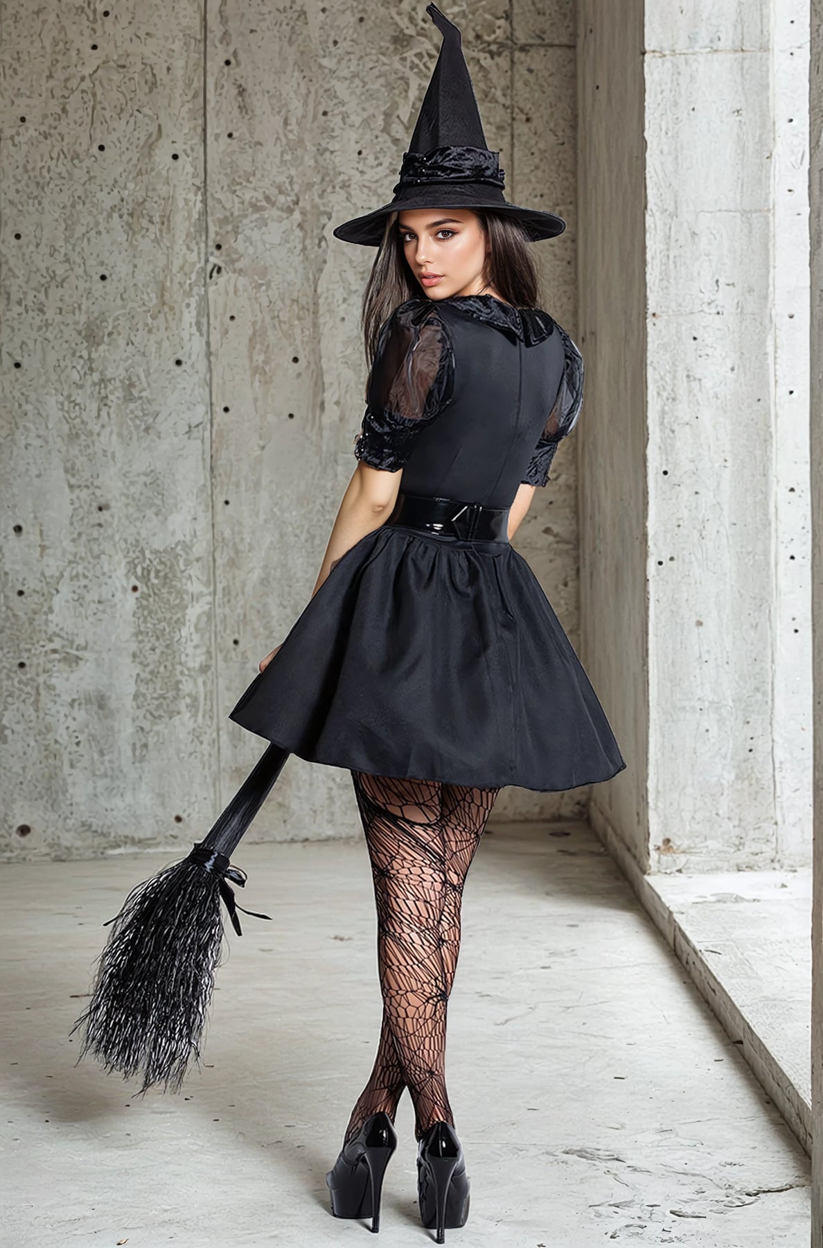 This sexy Vintage Witch costume includes a retro-style black dress with a cinched waist, mesh puffed sleeves, mesh bust with attached collar, vinyl belt, and witch hat. Broom not included.