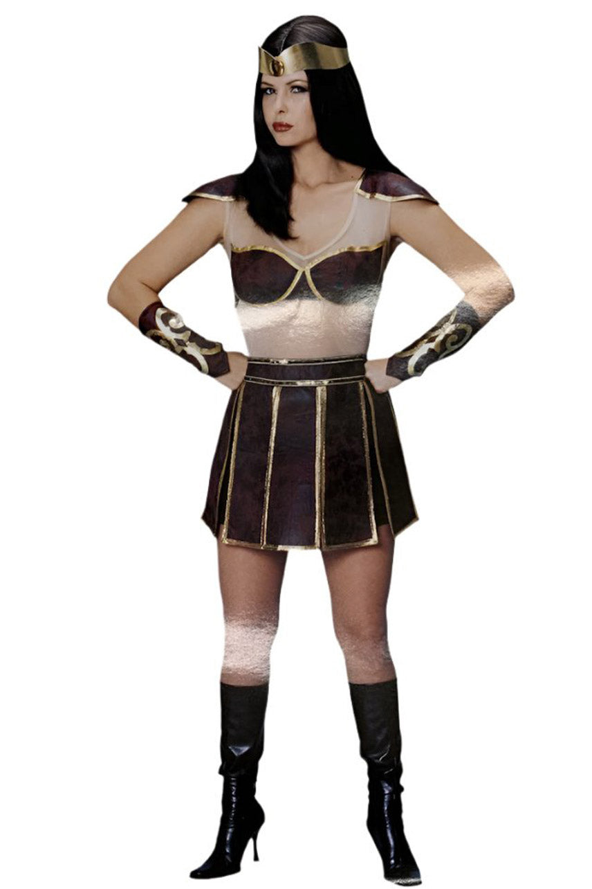 Unleash your inner strength and channel your inner warrior with Warrior Woman! This costume includes everything you need to stand out and dominate any costume party. From the fierce dress to the powerful headpiece and armguards, you'll be ready for battle. Boots not included.